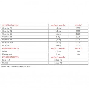 Las vitaminas B2, B3, B5, B6, B12 y C ayudan a disminuir el cansancio y la fatiga y contribuyen al metabolismo energético normal y al funcionamiento normal del sistema nervioso.