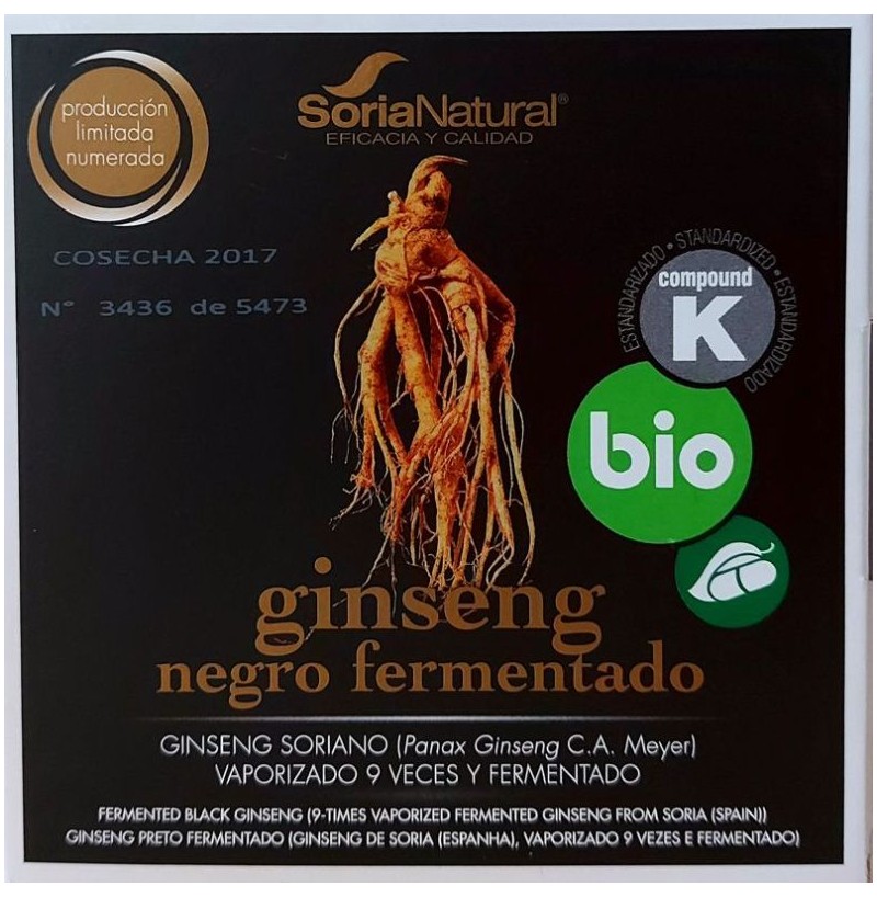 Polvo de ginseng* negro fermentado (procedente de 850 mg de ginseng soriano fresco (Panax ginseng C.A. Meyer, raíz) (210 mg)